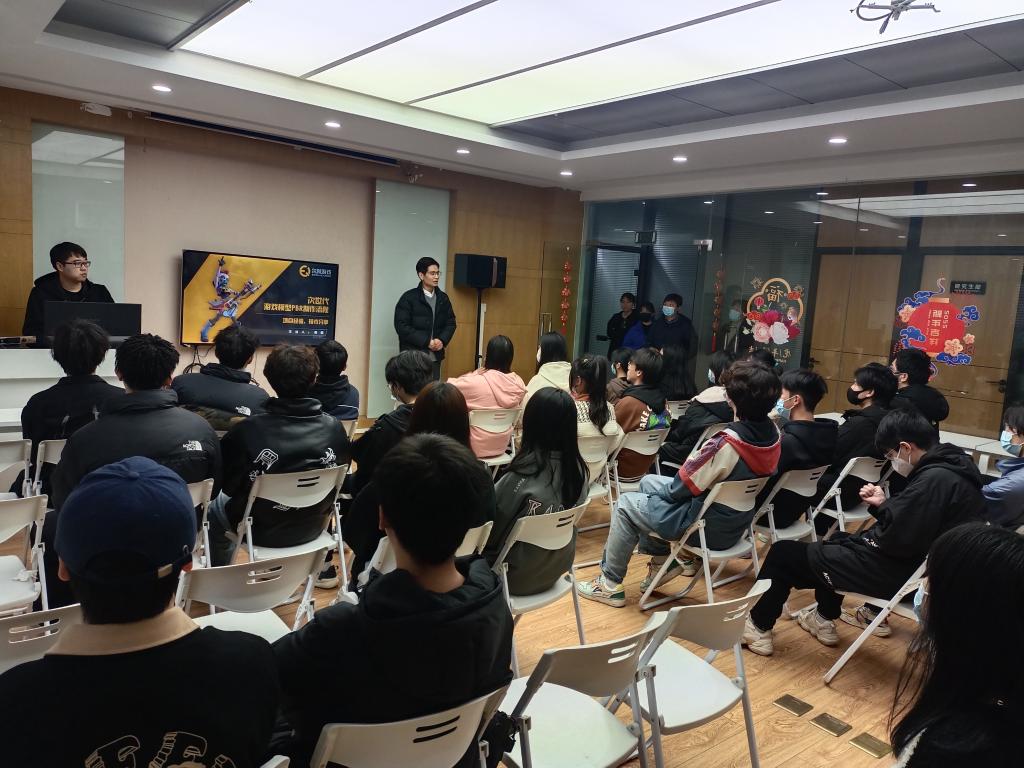 公司创始人唐元向老师和同学们介绍了企业的发展历程、企业文化、主营业务、薪酬待遇及发展前景等,并引导学生参观了办公区、展览室、休息区等,师生们边走边看边听,询问技术要点,感受工作氛围。游戏开发工程师倪奇以“次世代游戏模型PBR制作”为主题,为同学们上了一堂生动的技术分享课。副总经理涂一龙现场为同学解答了学习、实习及就业等诸多热切关心的问题。
