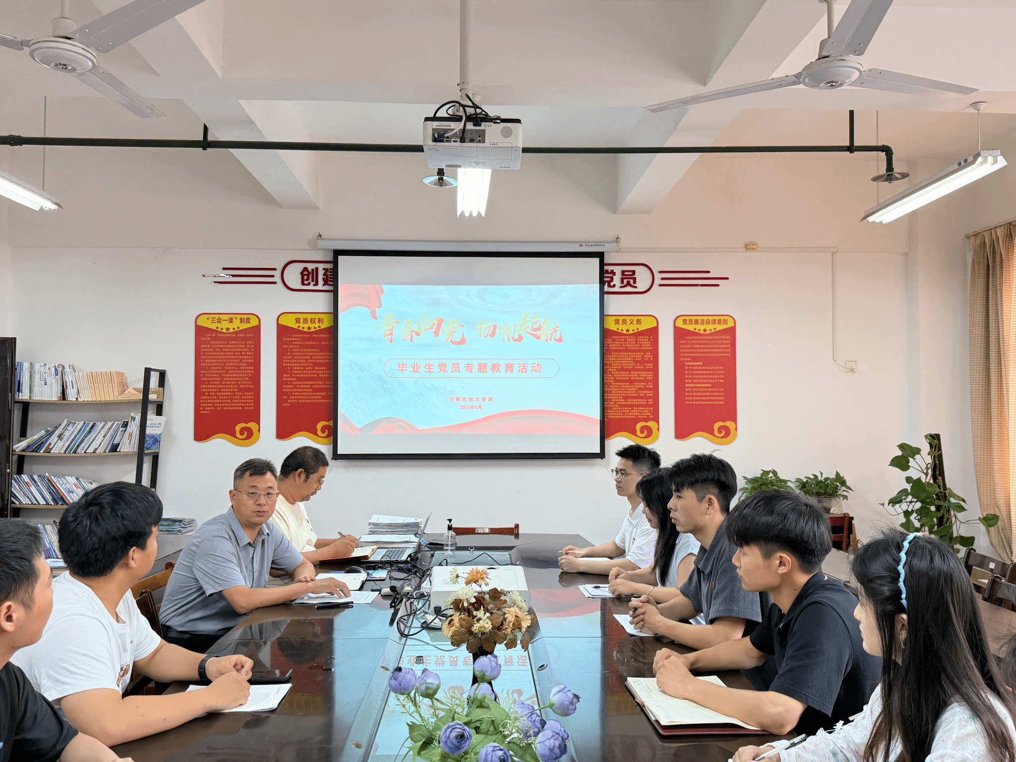 6月12日下午,计算机技术学院组织开展了“青春向党•扬帆起航”毕业生党员专题教育活动。院党总支副书记黄宝玉、学生党支部书记陈雄、学生党支部组织委员虞媛以及12名毕业生党员参加了此次活动。