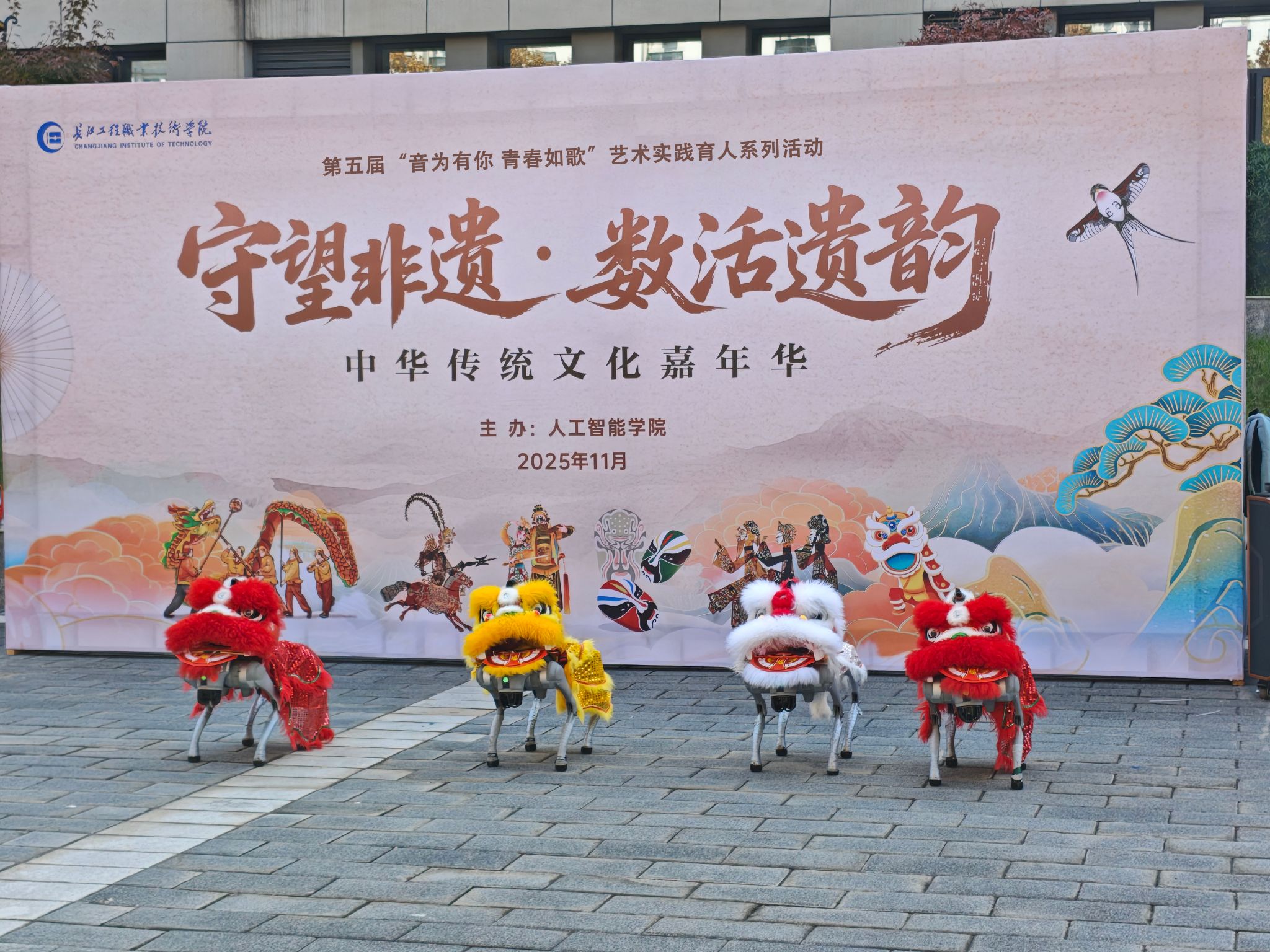 活动在悠扬的古筝暖场演奏中缓缓启幕,清越琴音瞬间将观众带入传统文化的诗意境界。随后,科技与非遗的精彩碰撞惊艳上演——机器狗带来的创新“舞狮”表演憨态可掬又科技感十足,赢得阵阵掌声与欢笑。紧接着,子衿国风社演绎的《青花瓷》舞蹈,以婉约舞姿勾勒出江南水墨意境,将开场氛围推向高潮。