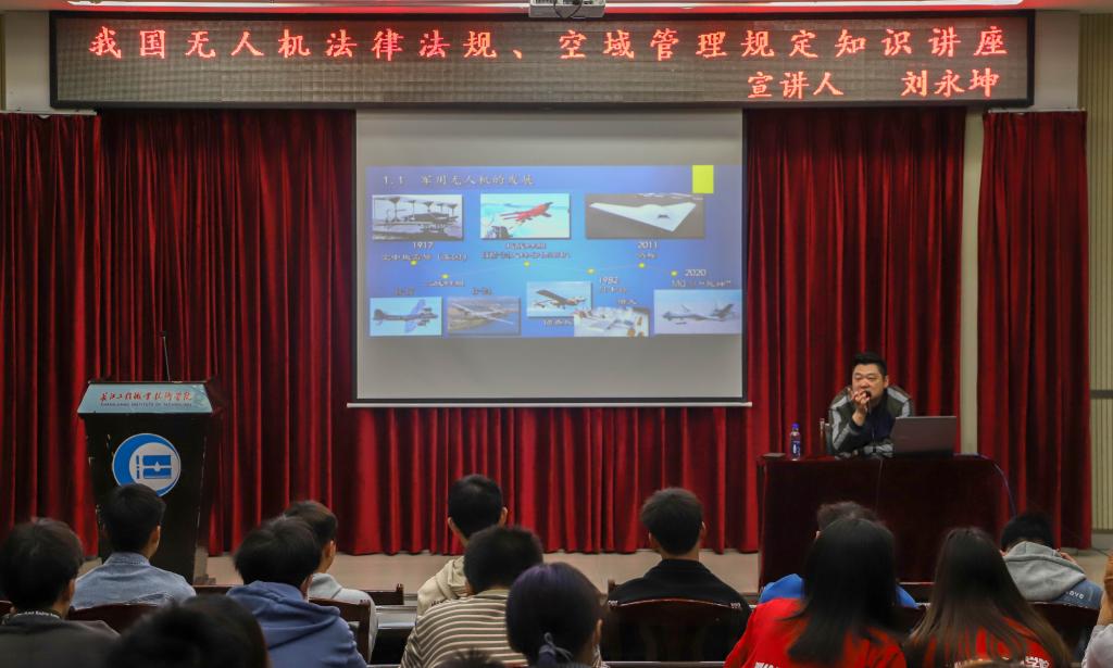 无人机飞行操作政策性较强,空域飞行控制严格。为了更全面深入的让学生掌握无人机飞行的相关法律法规,理解合法安全飞行的基本要求。下午14:00,原空军某部中校军官刘永坤为学生作了一场如何合法安全飞行为题的讲座。翔实的数据,经典的案例,让原本枯燥的法规讲座妙趣横生。在刘永坤的指导下,校园范围内空域教学飞行已获95028部队参谋部航管气象处批准,为校园合法安全飞行奠定了基础。