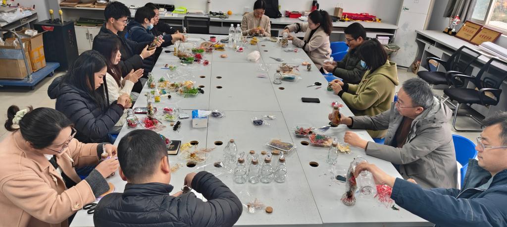 大家在舒缓的音乐中,冥想、放松,暂时放下日常事务,将注意力放在当下。接着,开展了浮游花瓶制作活动。大家挑选自己喜欢的花瓶和花材,制作属于自己的浮游花瓶。制作过程中,有的老师感叹“哎呀,一团乱”,还有的老师说“怎么总感觉不好看”,也有的老师说“不错,越做越好了”。在一片欢声笑语中,一个个各具特色的浮游花瓶作品诞生了。活动交流过程中一位老师说:我们的工作不是一样嘛,各种花材看着一团乱,不知道哪个先放哪个后放,但是静下心就会越做越顺,越做越好看了。