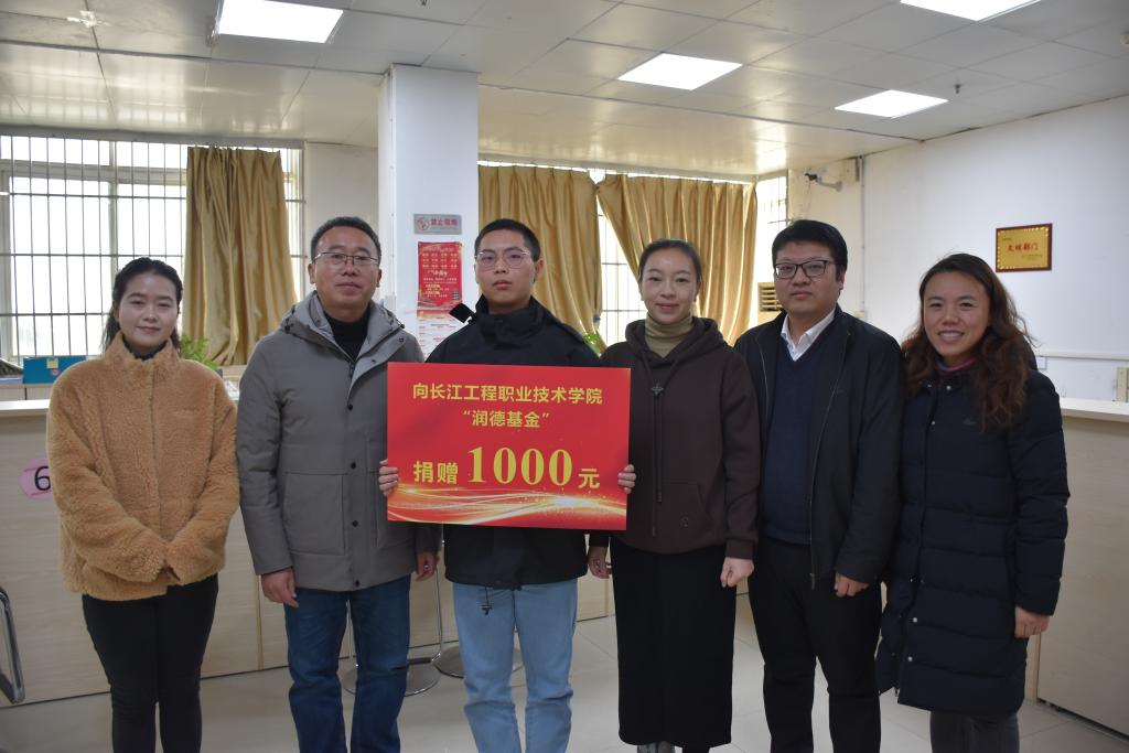 12月1日上午,计算机技术学院2023年国家奖学金获得者游豪明,向学校“润德基金”捐款1000元,用于帮助家庭困难的同学。党委学生工作部部长杨艳、财务处处长裴成超、计算机技术学院党总支书记汪吉平共同为游豪明颁发捐赠证书。