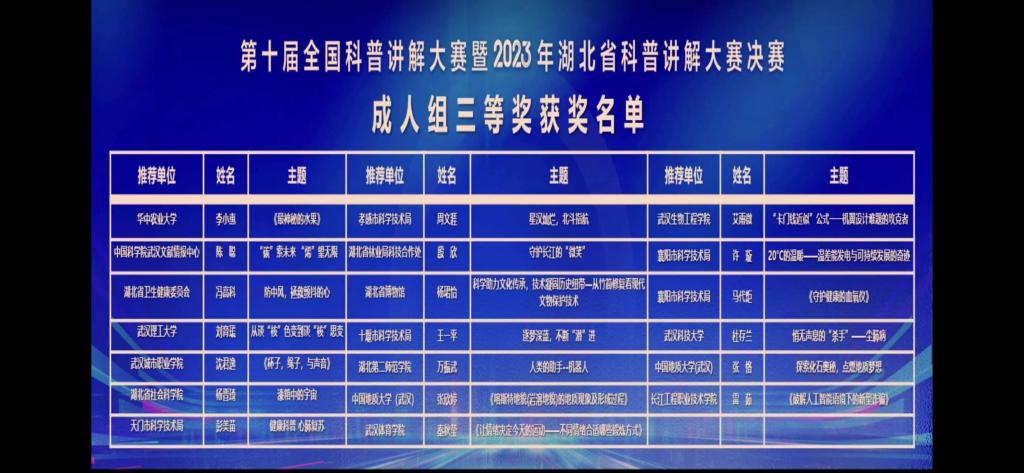 近日,2023年全国科普讲解大赛暨湖北省科普讲解大赛半决赛在中南民族大学举行。计算机技术学院数字媒体技术专业教师雷茹代表学校参赛,喜获三等奖。