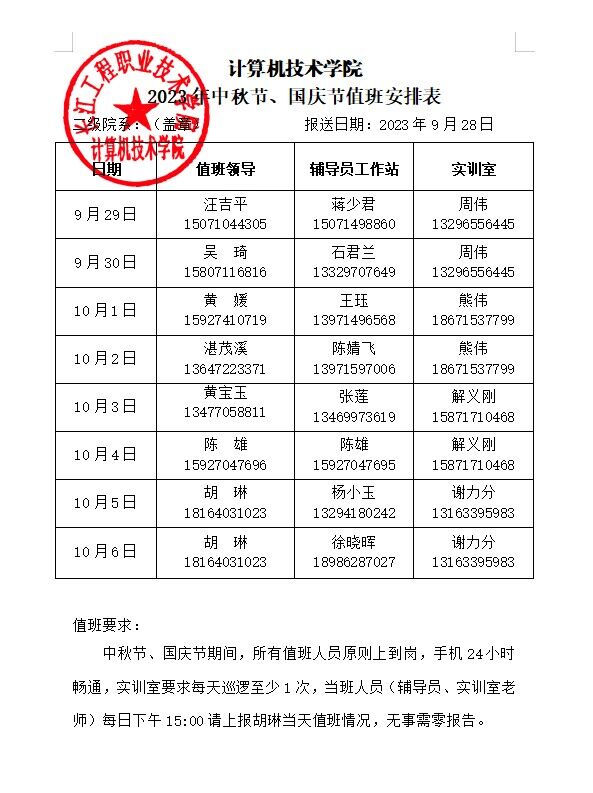 计算机技术学院2023年中秋节、国庆节双节值班安排表