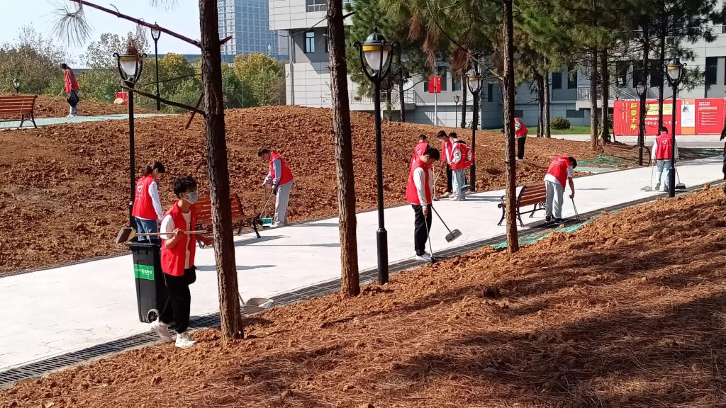 上午9:30团队成员在知辛堂门口集合分派清洁工具,随后各小组成员到达指定任务地点进行清扫。平湖广场、双冠峰及校园主干道为本次实践活动清扫地点。
