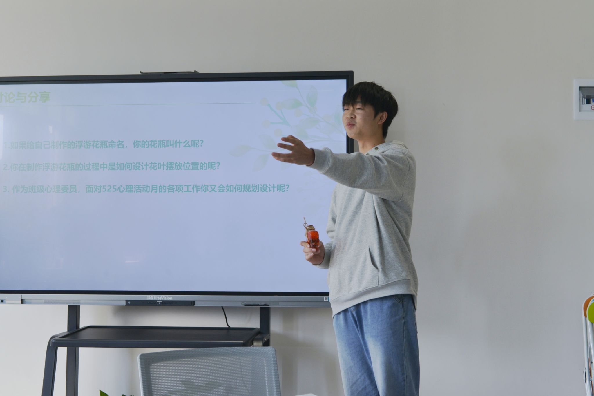 最后,杨小玉鼓励大家围绕“5•25”学生心理健康教育月各项活动的实施与落地,结合自身在浮游花瓶DIY过程中的体验与思考进行交流与分享。从花叶布局的艺术灵感,到作为心理委员如何高效规划与执行心理健康教育月活动,同学们踊跃发言,既有边实践边反思的智慧火花,也有积极实践后勇于表达的果敢态度。杨老师还倡导大家积极寻求老师、学长学姐及班委团队的智慧与支持,携手完成工作。