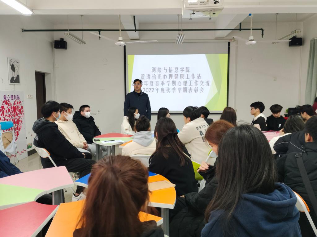 2月28日中午,测绘与信息学院“萱语拾光”心理健康工作站在长江楼1027活动室召开了2023年度春季学期心理工作交流会暨2022年度秋季学期表彰会。2021级心理委员代表和2022级全体心理委员参加会议,心理健康工作站站长黄宝玉出席会议,会议由指导老师杨小玉主持。
