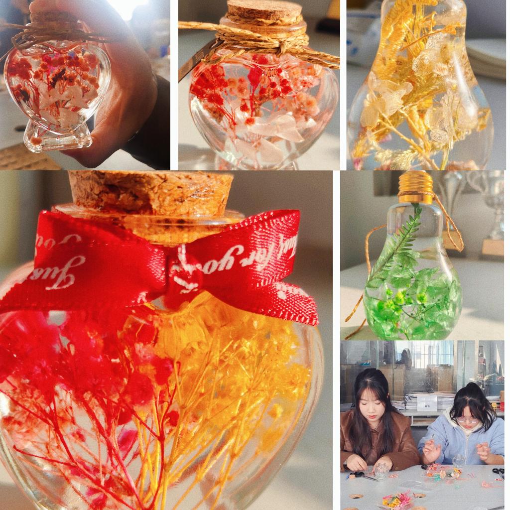 刚开始大家对于浮游花瓶的制作有些没有头绪,遇到阻碍甚至有些气馁。慢慢地随着一点点的修剪、搭配、调整、装饰,系上丝带,取上名字,一个个美丽的浮游花瓶带着创作者的满满心意应运而生。